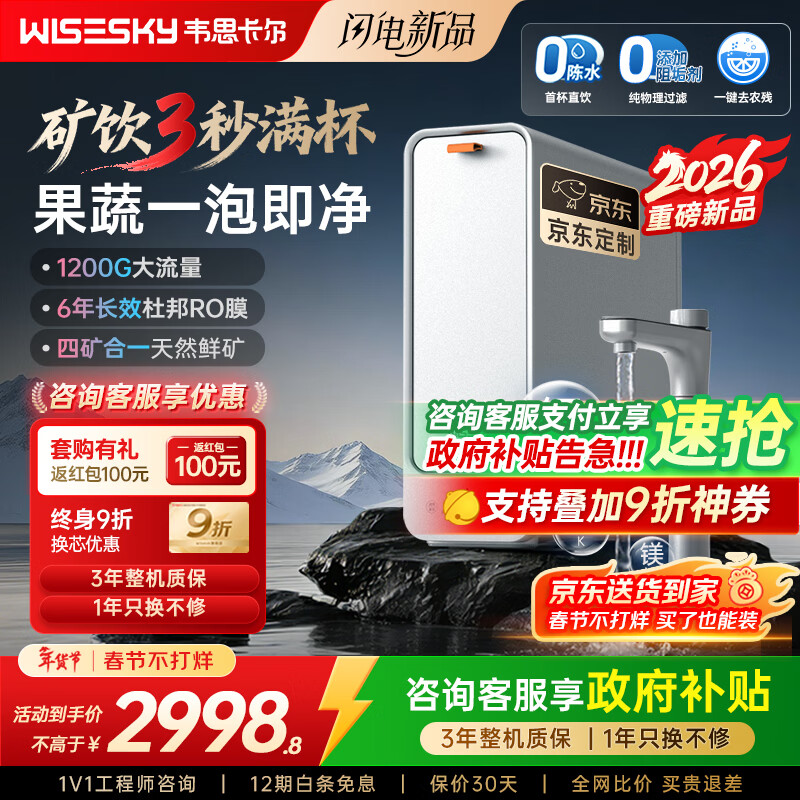 WISESKY韦思卡尔家用净水器D1双出水净矿1200G杜邦陶氏RO膜0阻垢剂破晓银