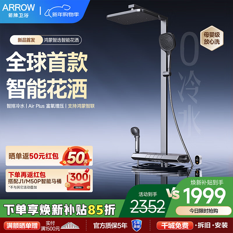 箭牌(ARROW)鸿蒙智选【智雨精灵】淋浴花洒套装0冷水恒温琴键增压花洒 鸿蒙智选花洒Pro-金属灰色