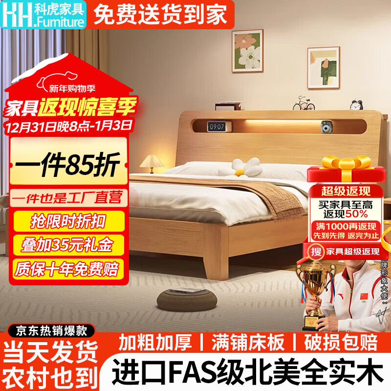 科虎实木床双人床1.8x2米主卧大床家用1.5x2米 原木色橡木床+10cm椰棕垫【松木排骨架】 150*200cm