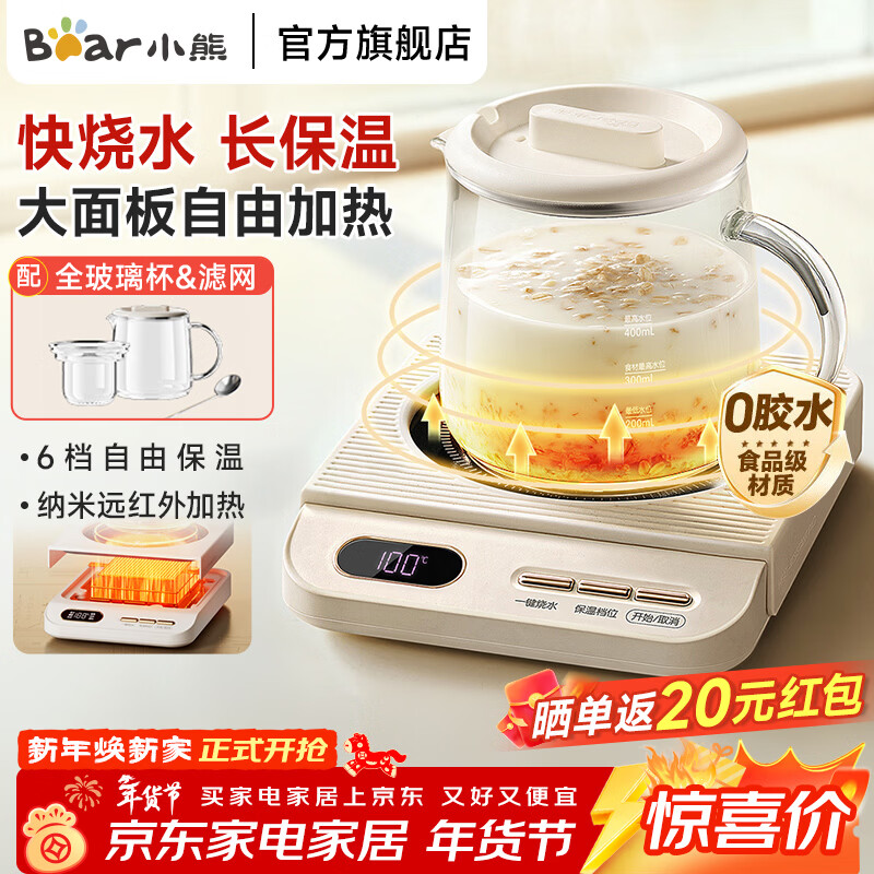 小熊(Bear)加热杯垫 保温杯垫 全玻璃养生壶 恒温多功能调温 热牛奶神器办公室茶座【配全玻璃杯&滤网】 DRBD-HC5E8 0.4L