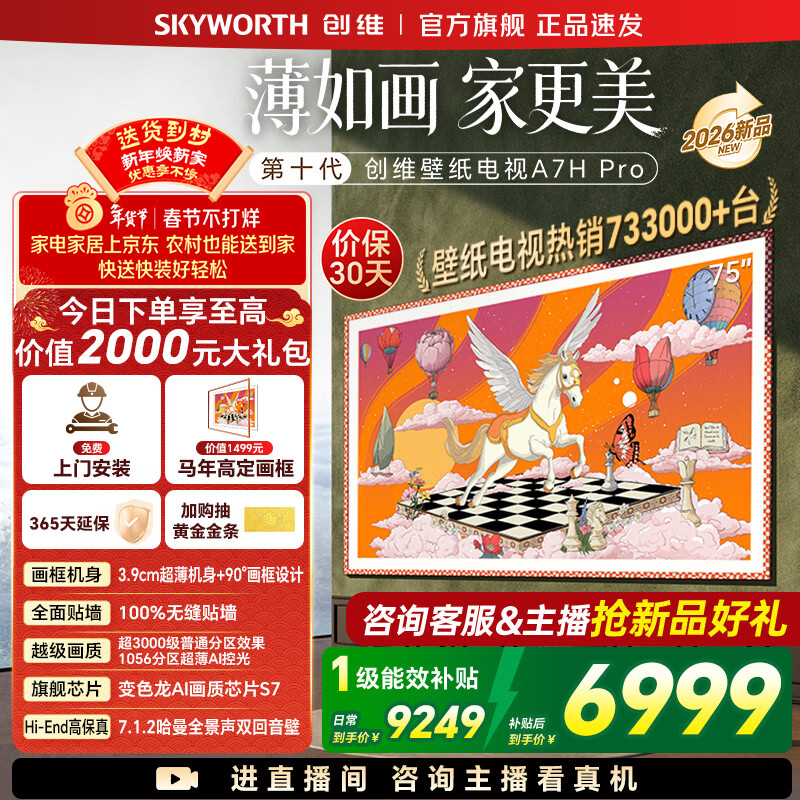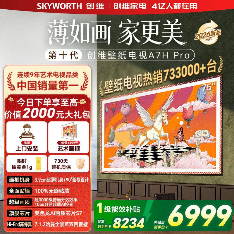 创维壁纸电视75A7H Pro 26年新品 国家补贴 MiniLED 超薄无缝贴墙 艺术电视A7FPro升级款【免费安装】 75英寸