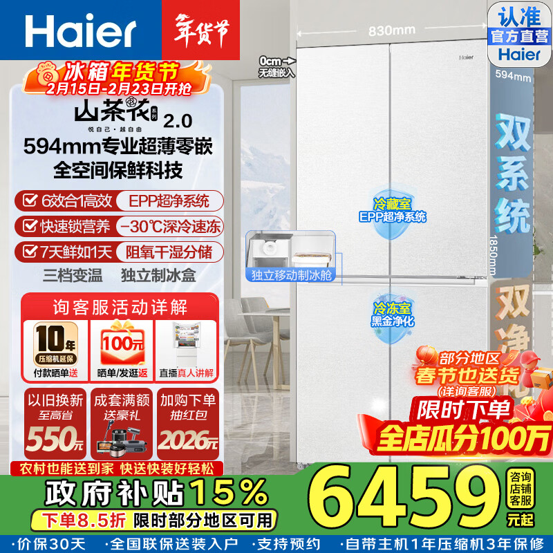海尔(Haier)山茶花2.0冰箱502L十字门双系统双净化不串味双擎恒鲜舱全空间保鲜超薄零嵌EPP黑金净化家用电冰箱 BCD-502WGHTD1CWLU1咨询客服领补贴