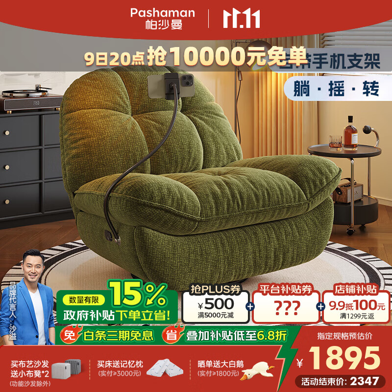 帕沙曼单人沙发布艺电动摇摇椅客厅书房阳台复古风功能懒人沙发椅2832ZX 【手动款】休闲椅·森林绿色 抗菌雪尼尔TY74