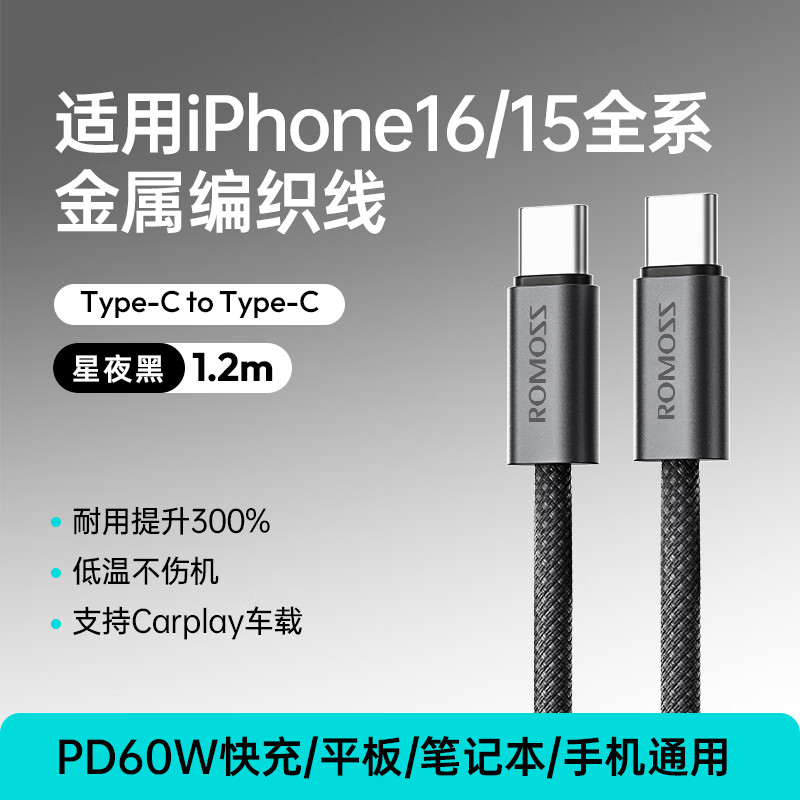 罗马仕适用苹果16充电线iPhone15promax充电器线usbc双typec数据线快充双头车载PD60W平板iPad手机笔记本 星夜黑1.2m