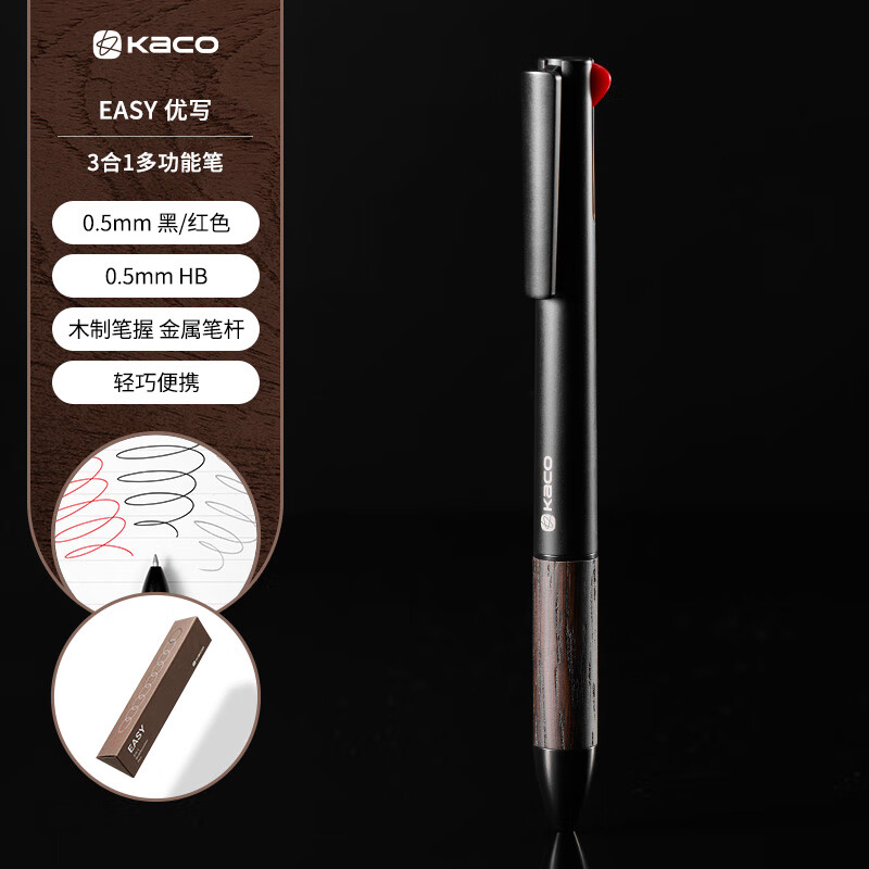 KACO EASY优写3合1多功能中性笔木质笔握金属笔杆0.5中性笔自动铅笔黑红色重点笔商务办公用品 木质笔握金属款优写单支