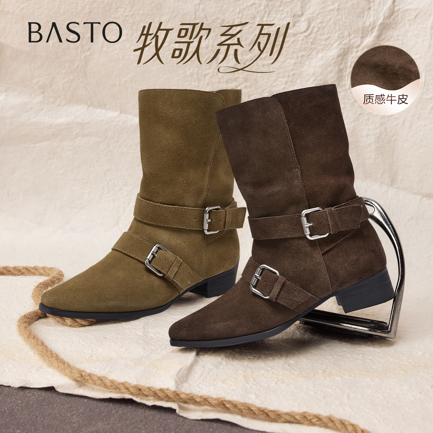 百思图2025冬季新款真皮西部靴时尚复古粗跟尖头女短靴K5053DZ5 棕色 36