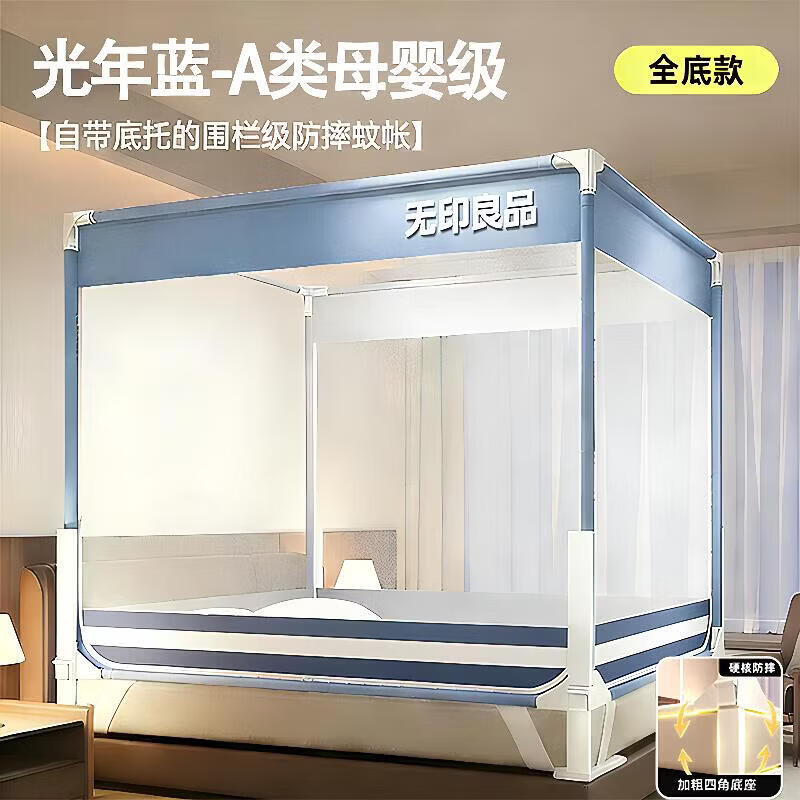 无印良品升降床围栏防摔蚊帐1.5x2米二合一家用一体式免安装蚊帐防摔婴儿 光年蓝【A级全底帐纱+防尘顶+风扇杆】 1.8m床一宽180x长200x高170cm围栏级防摔支架