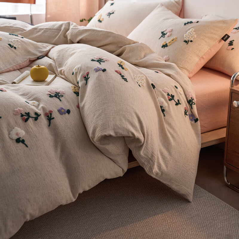 ROLAND LIVE天丝棉麻四件套春夏新款透气花朵刺绣被套床单家用卧室床上用品 KZ 天丝棉麻四件套-紫茉白 1.8米床 床笠款 【被套200*230cm】