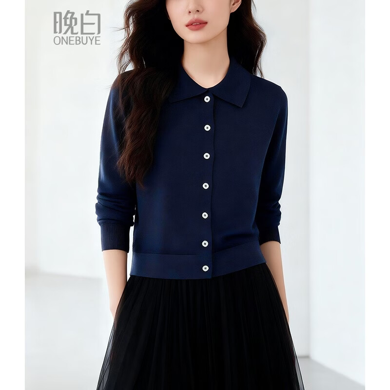 晚白【新品】2026年春款经典简洁翻领毛衣利落合身通勤百搭针织衫女 深蓝色 L