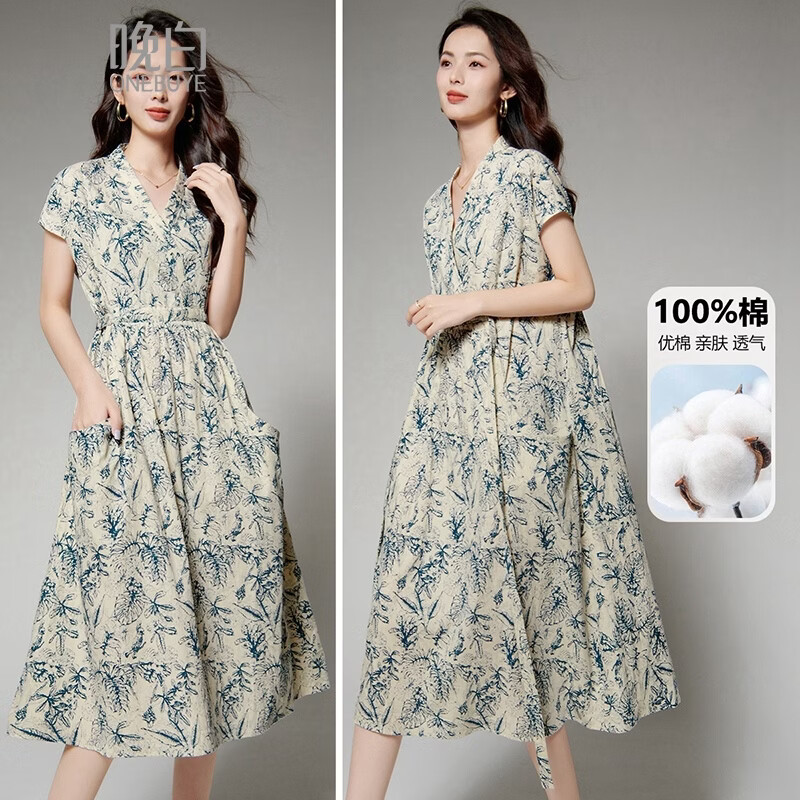 晚白【新品】2026年春款印花全棉休闲裙子宽松大码系带收腰短袖连衣裙 花色 M