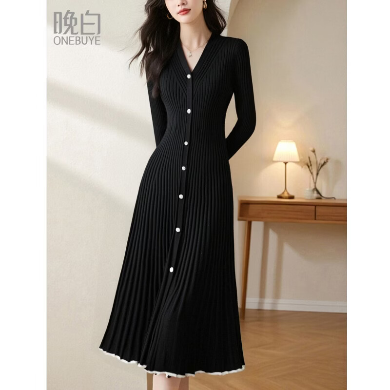 晚白【新品】2026年春款V领黑色修身羊毛针织连衣裙【不含腰带】 黑色 M