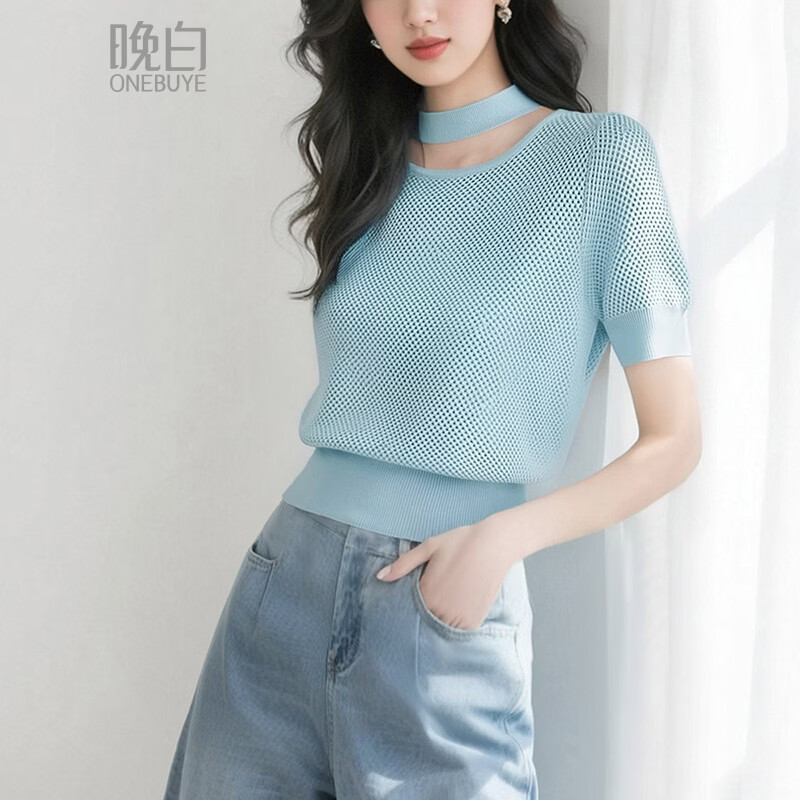 晚白【新品】2026春夏款时尚清新显白baby蓝针织衫冰丝镂空针织上衣女 蓝色 M