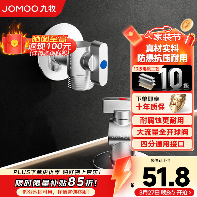 九牧(JOMOO)角阀球阀铜阀体大流量三角阀燃气热水器角阀壁挂炉亮银色八字阀 大流量1冷1热球形角阀套装