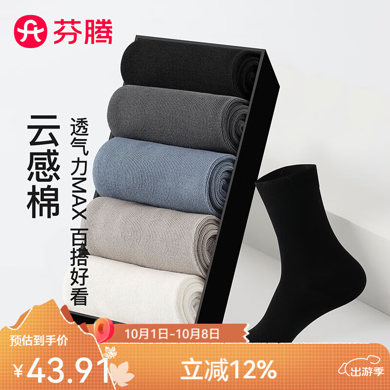 芬腾男袜【新疆棉】5双装纯色袜男士袜子透气亲肤中筒袜运动通勤商务 白色/深灰/黑色/灰蓝/卡其 5双 均码