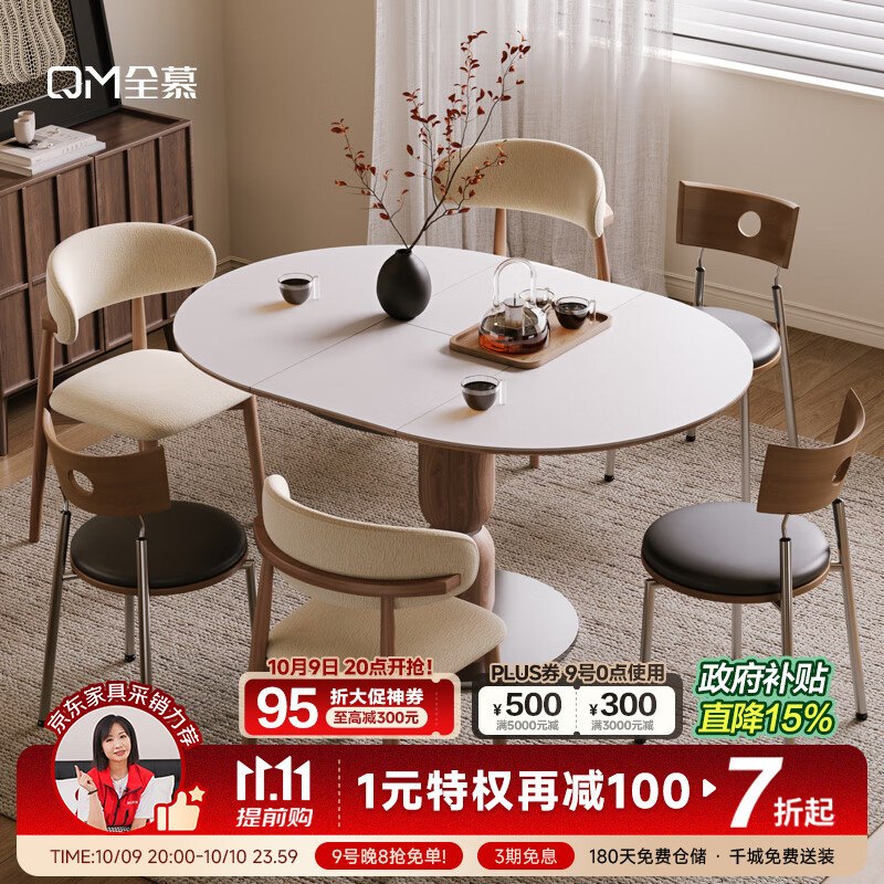 全慕(QUANMU)实木餐桌椅组合中古风方圆两用折叠可伸缩小户型家用岩板吃饭桌子 0.9米伸缩餐桌+2把【贝歌·餐椅】