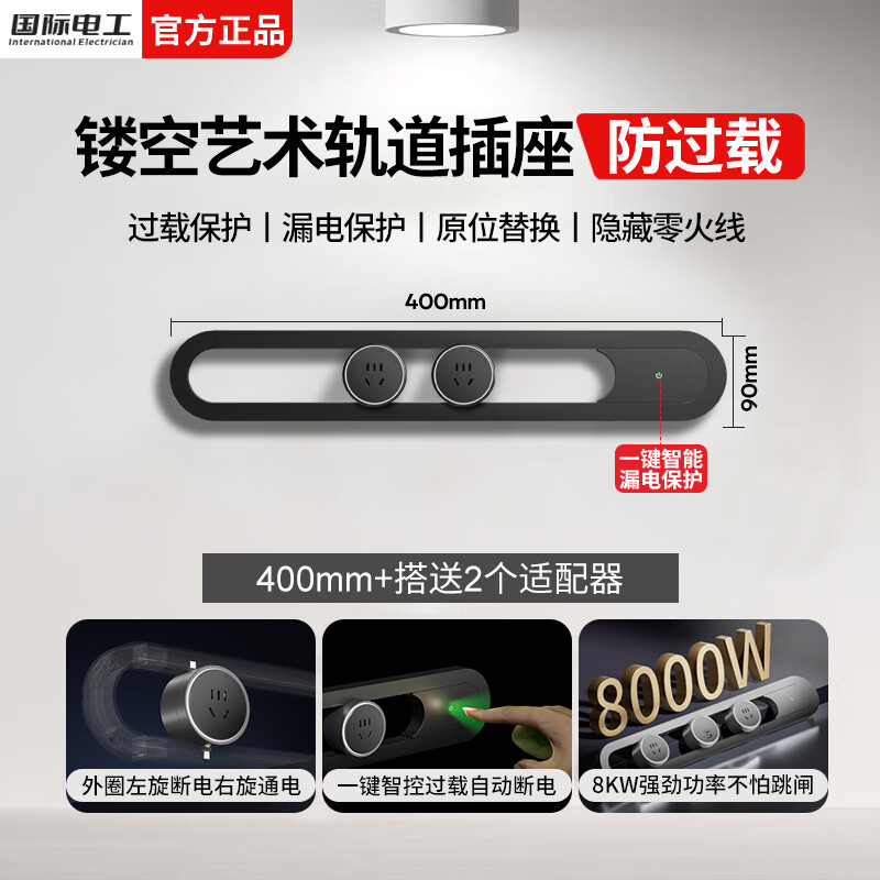 国际电工明装滑动轨道插座移动插排厨房壁挂式镂空设计过载保护轨道插板 【漏电/过载保护】40厘米+2个五孔插座
