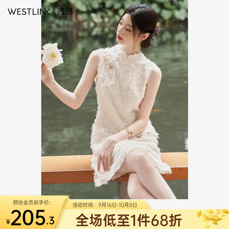 西遇新中式国风流苏肌理剪花连衣裙女无袖收腰A摆连衣裙 杏色 M