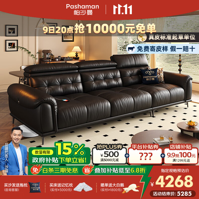 帕沙曼真皮沙发意式复古客厅直排可调节靠背2025新款头层牛皮黑色7062ZP 2.8米多人位(头靠可调节 靠背USB充电) 【臻享版l 柔滑头层牛皮MU】