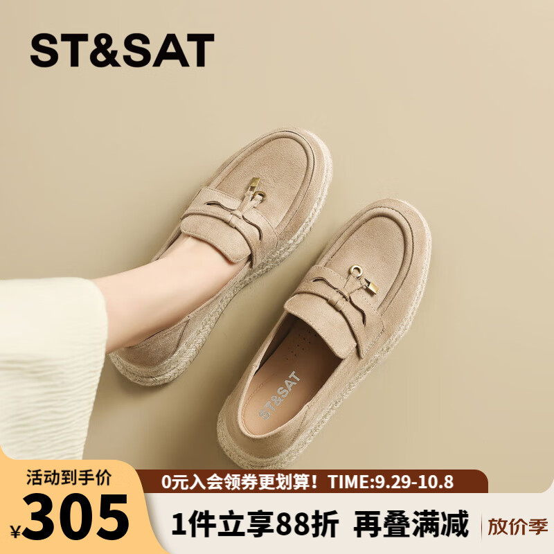 星期六(St&Sat)轻奢复古百搭乐福鞋编织鞋底一脚蹬袋鼠鞋单鞋女鞋子JXSSD3111WLF 杏色 39