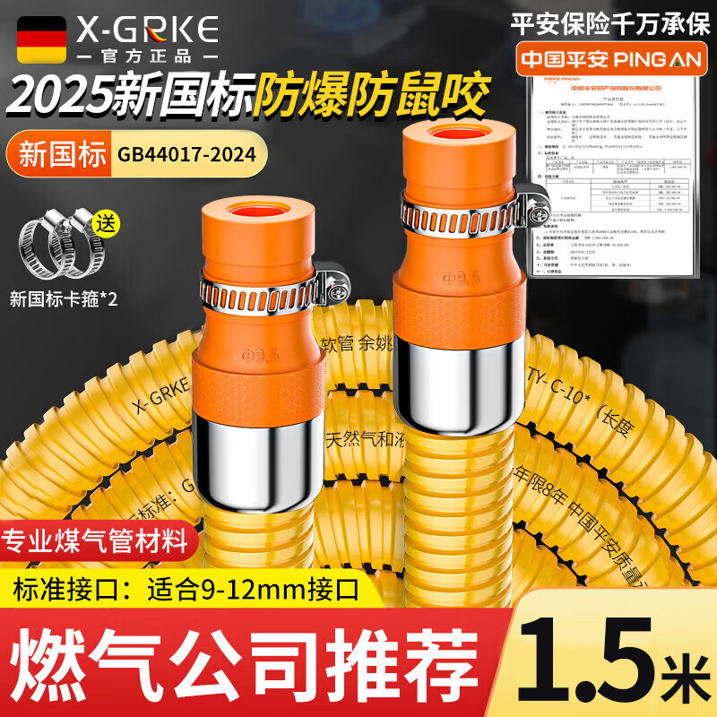 X-GRKE【德国】燃气管煤气管天然气液化气专用新国标金属防爆家用波纹管 1.5米丨新国标煤/燃气管 质保10年丨全新升级加厚防爆