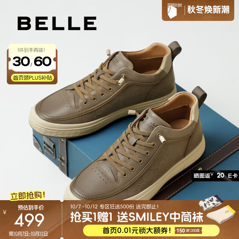 百丽(Belle)时尚休闲高帮板鞋男鞋2025冬季新款牛皮革印花工装鞋加绒A2188DM5 卡其色-单里 42 (260mm)