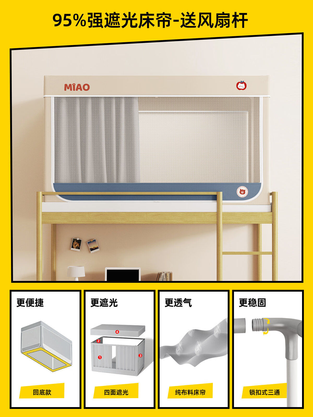 高睿学生床帘蚊帐一体式强遮光宿舍上下铺专用床遮光布下桌遮挡帘梭织 四面遮光-猫爪灰-回底-Pro锁扣支架 【宽90*长190*高120】上铺专用/ 三开门