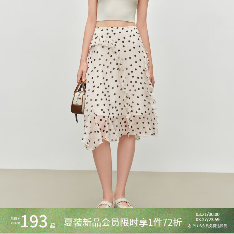 自巧波点系列 小个子荷叶边不规则半身裙女2026夏新款垂感印花裙 白底黑点 XXS (尺码:1)
