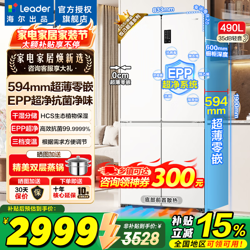 海尔冰箱出品统帅490升四开门十字门516超薄零嵌入式电冰箱一级能效变频节能以旧换新电冰箱 超薄594mm零嵌+EPP净+阻氧干湿分储