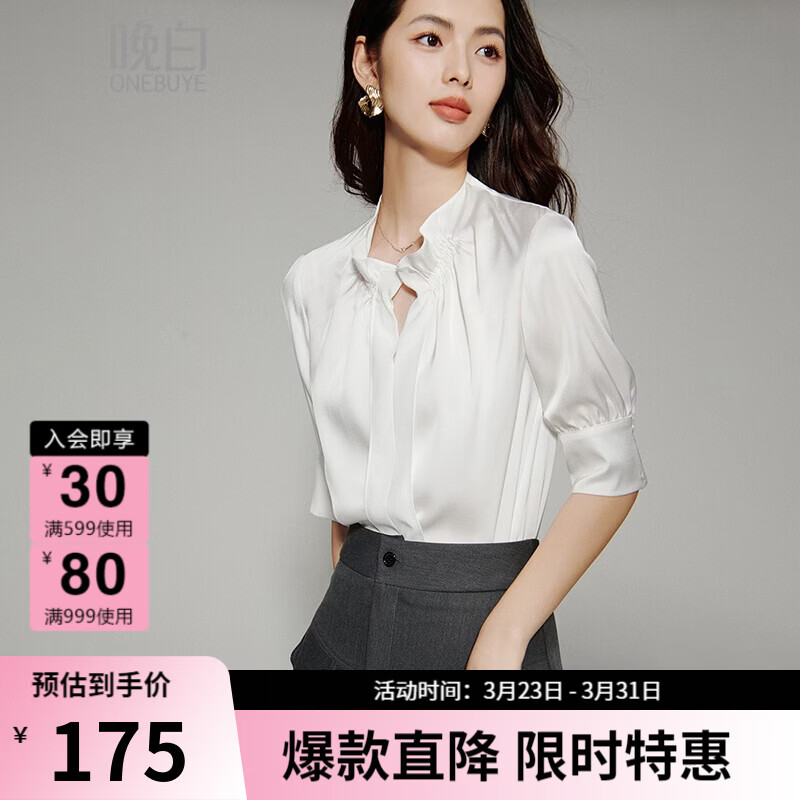 晚白【新品】2026年春款气质轻熟风V领衬衣垂感缎面优雅通勤衬衫女 白色 S