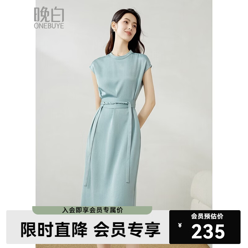 晚白【新品】2026年春款时尚立领裙子系带收腰缎面丝滑连衣裙 云水蓝 M