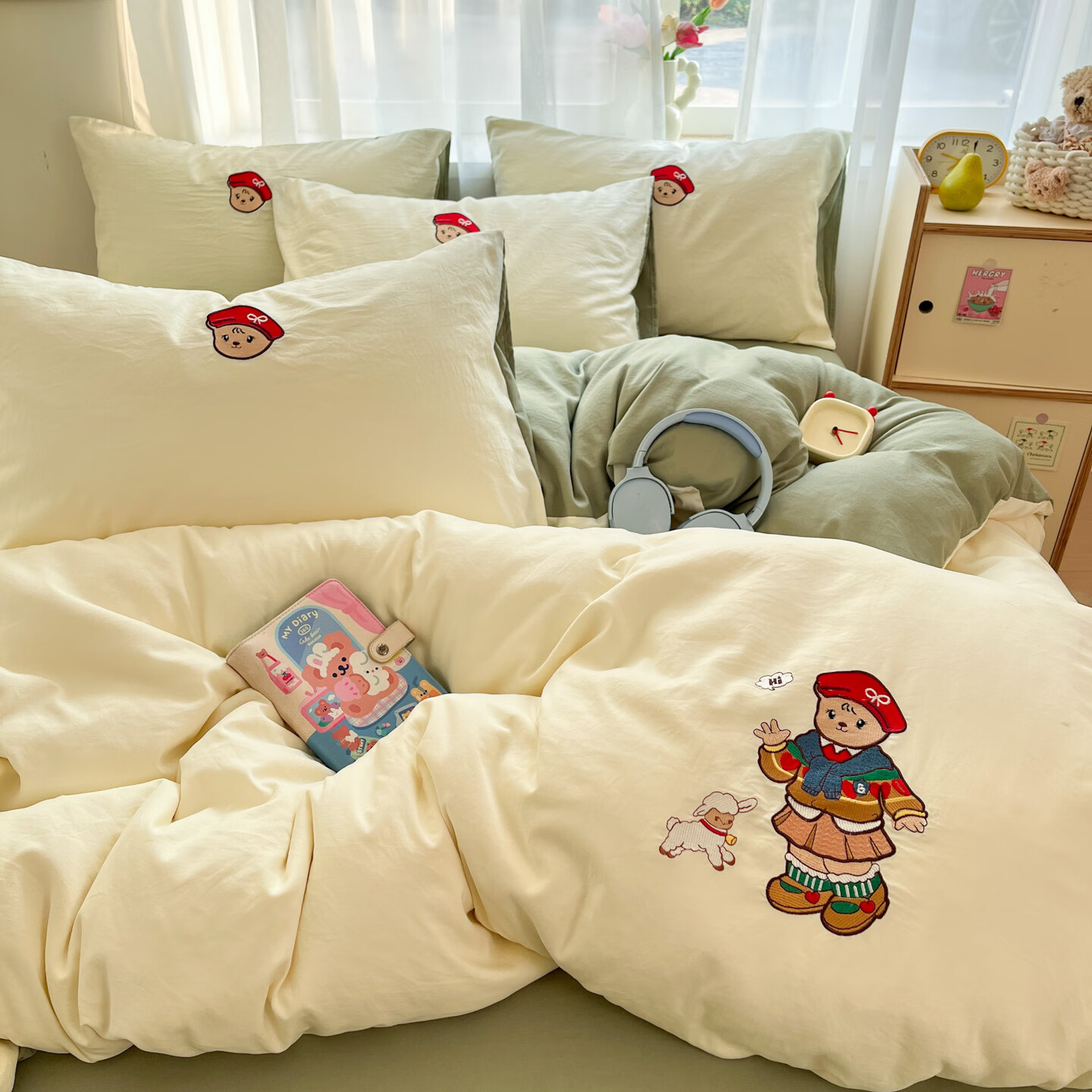 VJE软糯云朵水洗棉四件套可爱卡通刺绣床单被套亲肤棉学生宿舍三件套 放羊熊 四件套1.8m 床单款 (被套200*230cm)