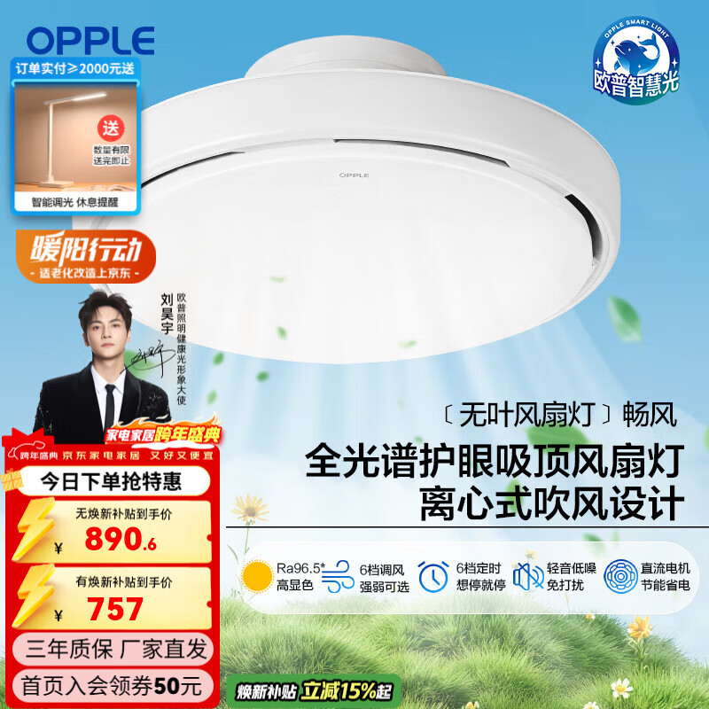 欧普照明(OPPLE)【无叶风扇灯】全光谱护眼卧室客厅现代简约调光灯具 离心吹风技术/60瓦三档调色