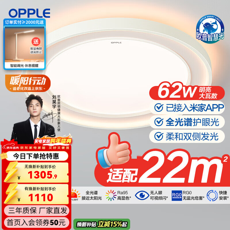 欧普照明(OPPLE)25新欧普LED全光谱婴幼儿童0眩光专业护眼吸顶灯具饰客厅灯TC 母婴级护眼62瓦3950lm智控圆卧