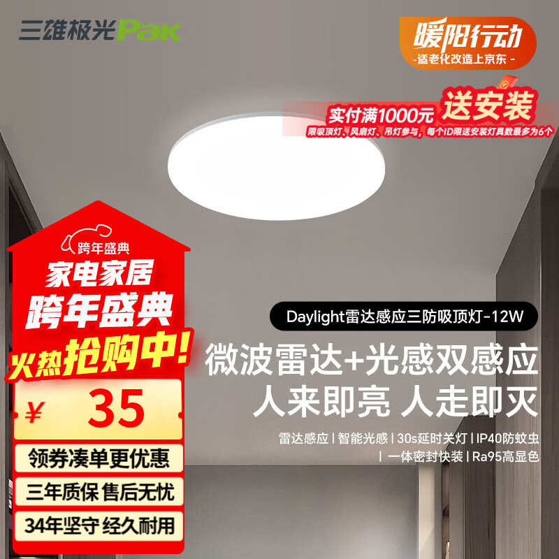 三雄极光led雷达感应吸顶灯超薄三防快装圆形灯阳台走廊楼梯过道玄关灯具 12W 8㎡内适用 900lm P1 雷达+光感感应 RA95