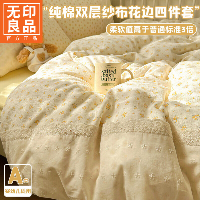无印良品A类花边床单被罩四件套床上用品双层纱被套亲肤裸睡三件套床笠款4 宽花边-蜜糖黄花 【加厚双层纱面料亲肤裸睡】 1.8m 床单款 四件套-200cm*230cm