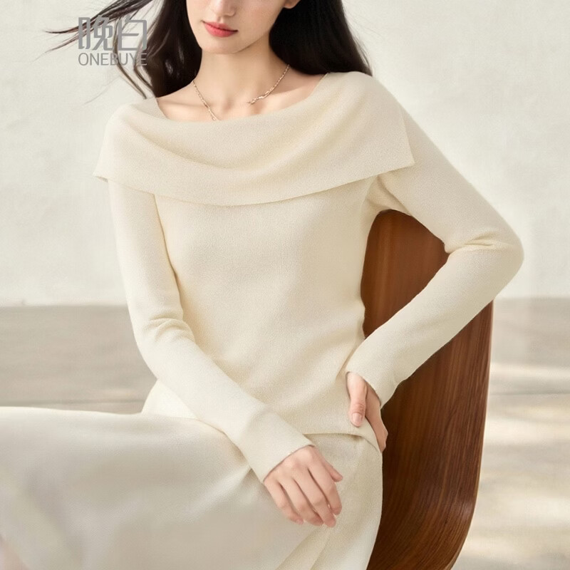 晚白2026春款时尚一字肩大翻领奶油风毛衣减龄显年轻舒适针织衫 米杏色 M
