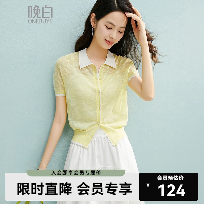 晚白【新品】2026年春款时尚撞色翻领上衣轻薄弹力休闲针织开衫女 黄色 M