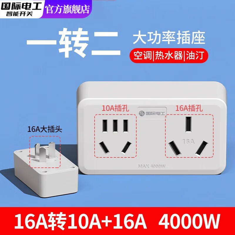 国际电工空调插座转换器16A转10A一转一排插带开关三孔转五孔转换插头家用 直插式扩展16A转10A+16A