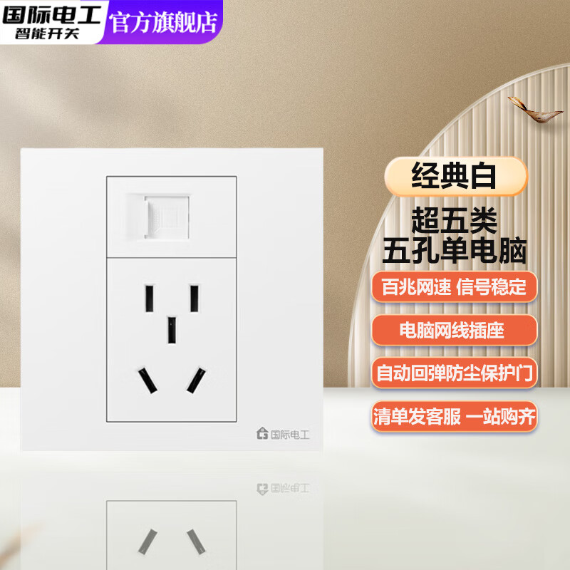 国际电工86型墙壁灰色千兆网络6六类屏蔽电脑网线插口加5五孔电源插座面板 经典白-超五类电脑+五孔