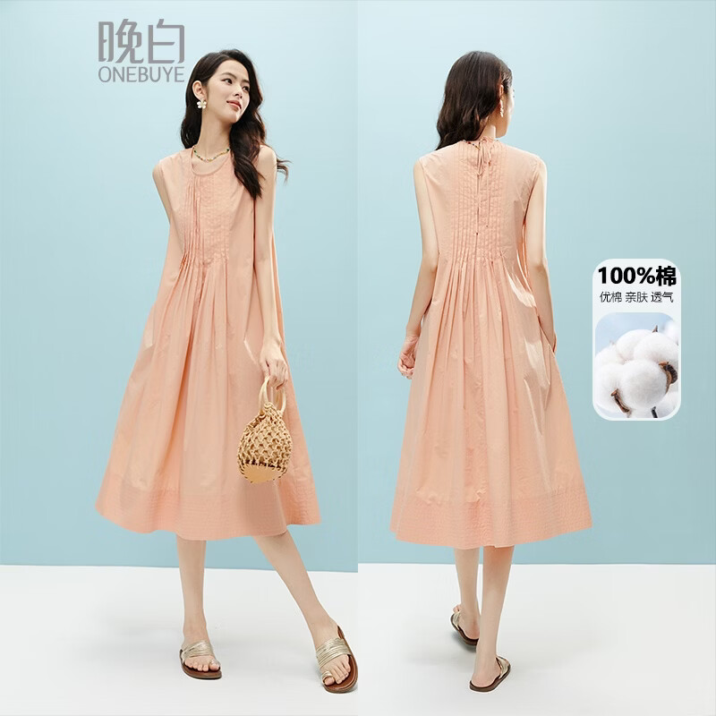 晚白【新品】2026年春款时尚减龄全棉裙子高腰捏褶宽松舒适无袖连衣裙 橘粉色 M