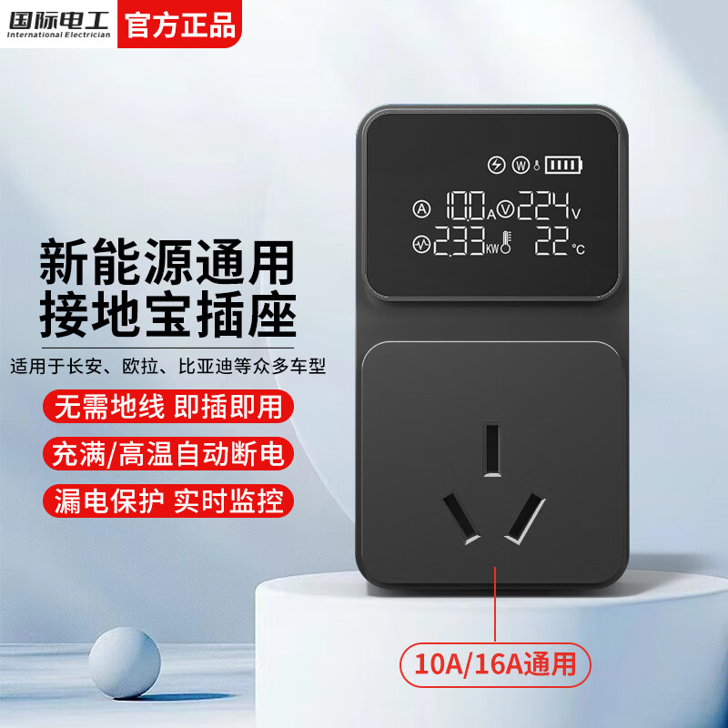 国际电工接地宝免接地线10A转16A大功率新能源汽车通用充电插座转换器 黑色接地宝【豪华款】