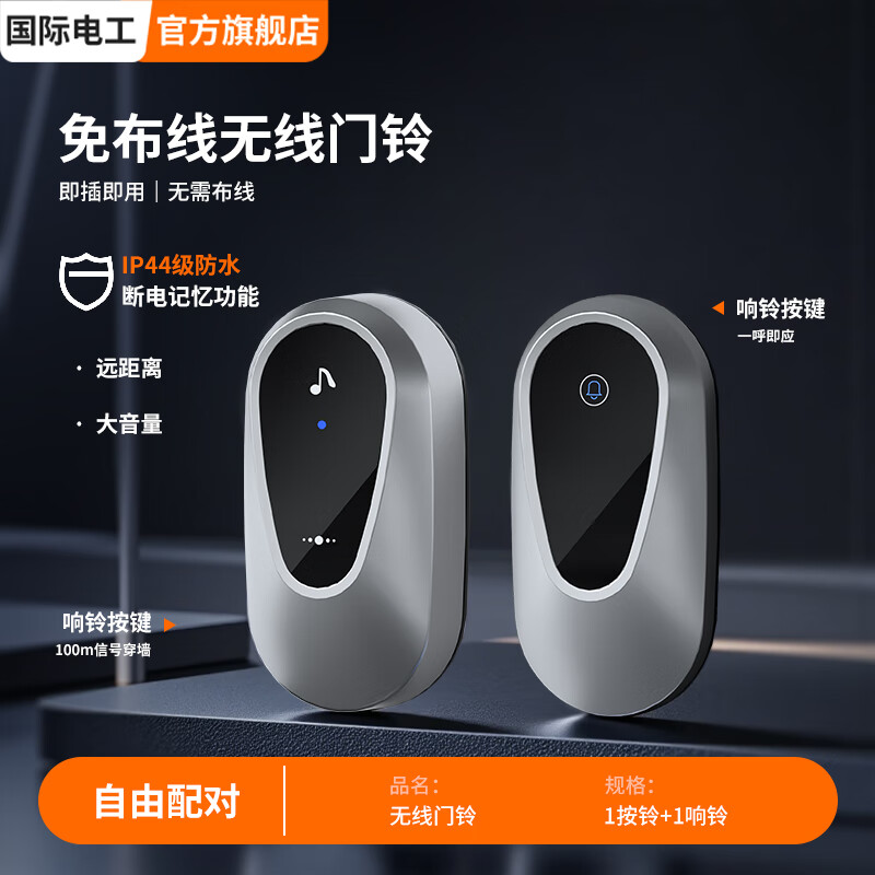 国际电工防盗门铃家用无线感应器防盗门防盗门报警器户外防水大音量 升级款银黑色 1个按铃+1个响铃