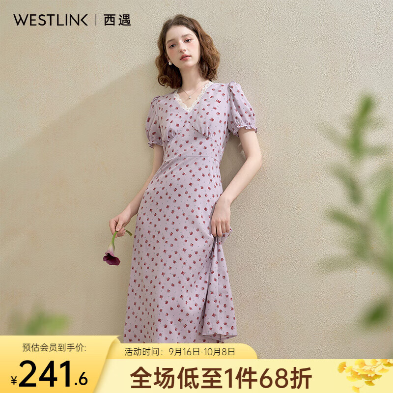西遇浪漫玫瑰蕾丝花边V领碎花连衣裙女2025秋季新款收腰显瘦长裙七夕 紫色 XL (170)