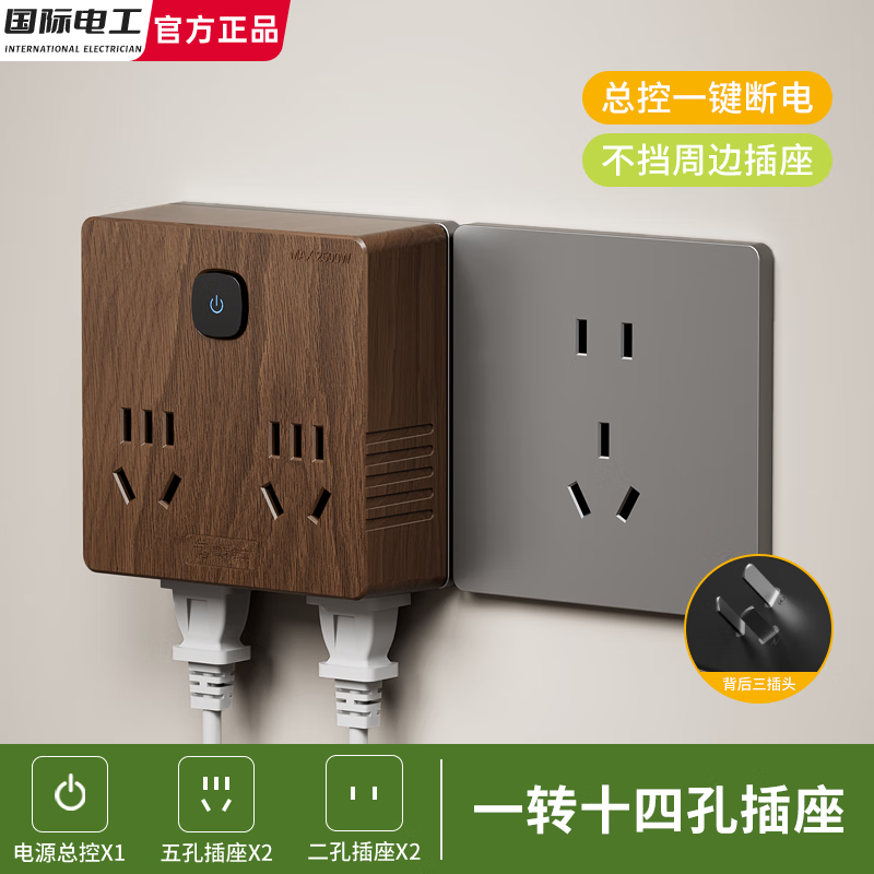 国际电工胡桃木纹转换器插座多功能面板扩展排插无线插头一转多孔宿舍家用 一转14孔【仿胡桃木纹】