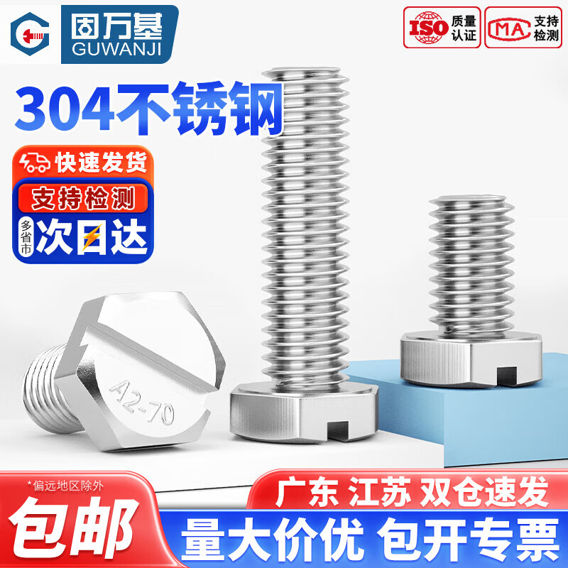 GUWANJI304不锈钢开槽一字外六角螺丝GB29.1头部带槽六角头螺栓M4M5M6M8 M8x25(10只)
