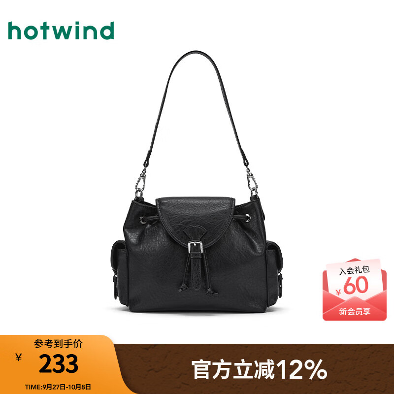 热风(Hotwind)女士单肩包2025年冬季新款女士时尚复古翻盖抽绳斜挎包旅行包 01黑色 F