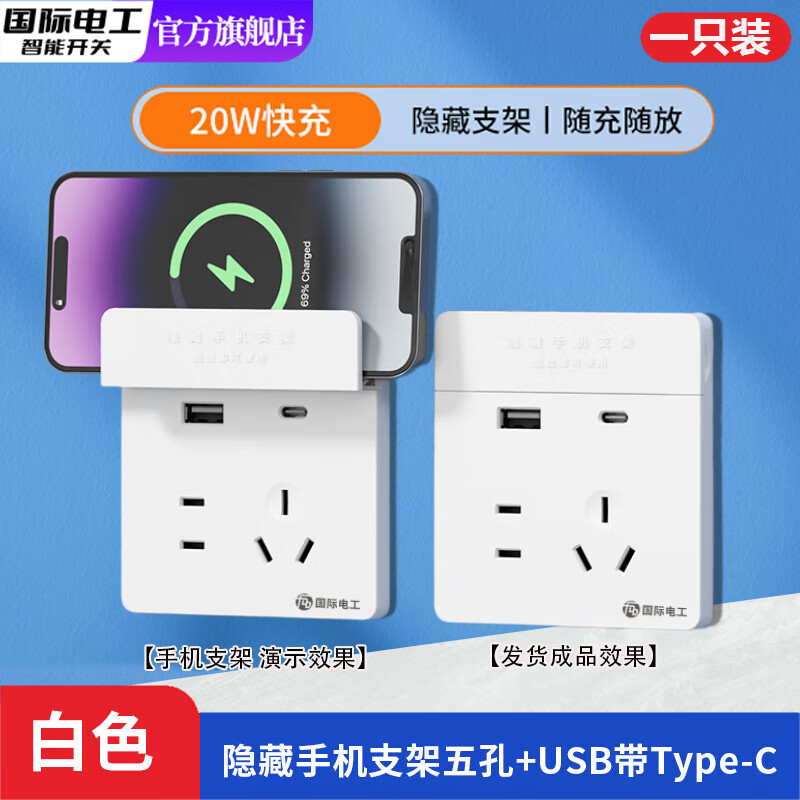 国际电工家用86型墙壁20w快充Type-C5五孔带USB手机支架充电开关插座面板 带支架-20W快充五孔USB+C-经典白