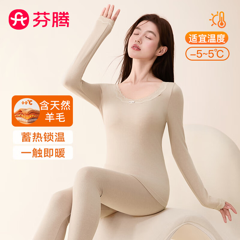 芬腾保暖内衣女2025秋新款含绵羊毛防起球套装蕾丝打底衣长袖秋衣秋裤 肤色 2XL