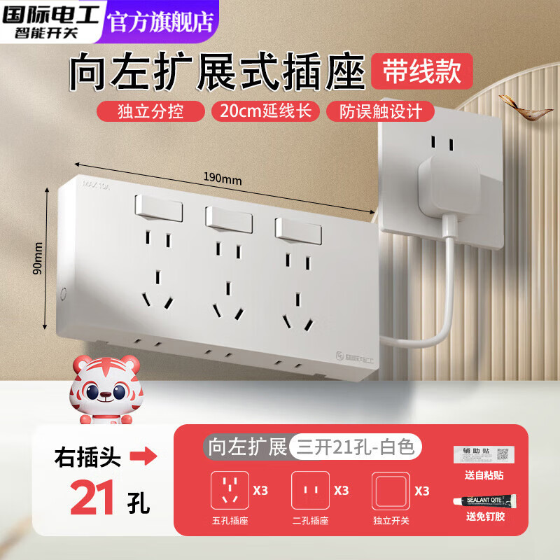 国际电工86型明装扩展插座厨房墙壁排插多功能转换器插座多孔位插头插线板 向左扩展-【白色三开21孔分控】免接线