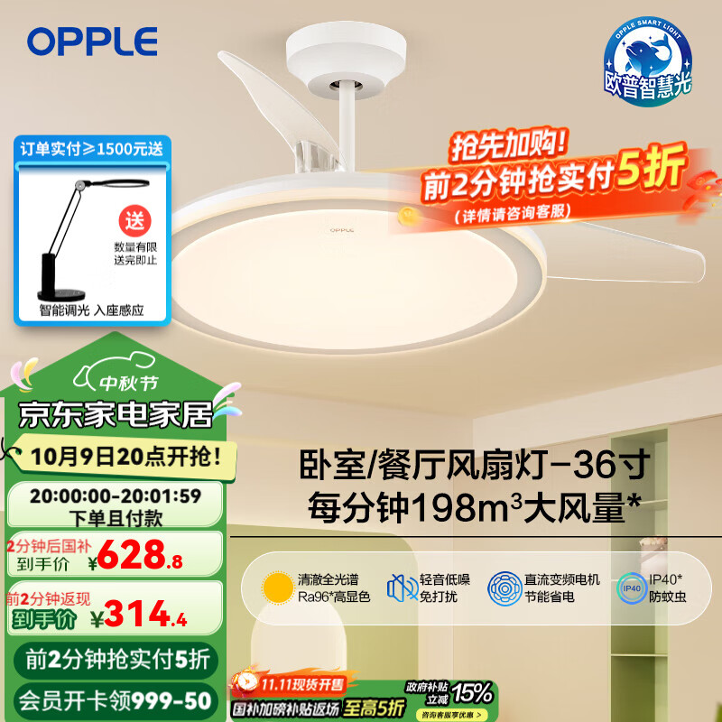 欧普奶油风隐形扇风扇吊灯餐厅卧室家用简约电扇风扇灯FS 【全光谱】36寸54瓦三色/遥控